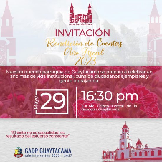 Unidos por la historia y la tradición, el GAD Parroquial de Guaytacama encabezado por el presidente Abg. Faustino Travez Vargas , hace la cordial invitación a la Rendición de Cuentas año Fiscal 2023 y Sesión Solemne Conmemorativa por los 163 años de parroquialización de nuestra querida Guaytacama.