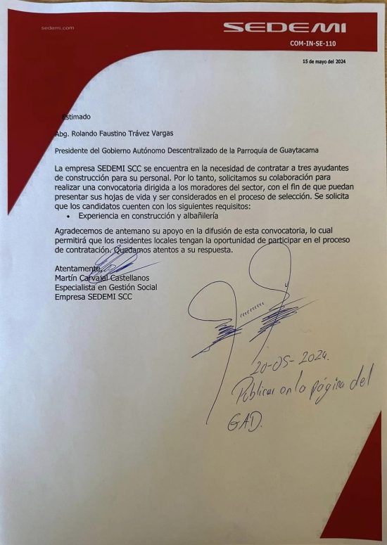 El GAD Parroquial de Guaytacama y SEDEMI SCC se reunieron para aunar esfuerzos en la búsqueda de oportunidades laborales para los profesionales de la construcción en la parroquia.