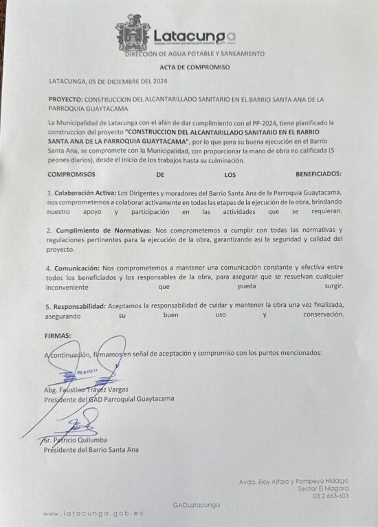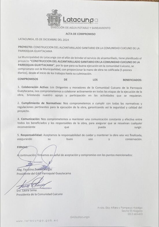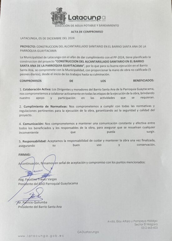 Con gran satisfacción, el Gobierno Autónomo Descentralizado Parroquial de Guaytacama ha dado el puntapié inicial a un proyecto anhelado por toda la parroquia: la construcción del sistema de alcantarillado (Comunidad Cuicuno, Barrio Santa Ana, Barrio 12 de Octubre).